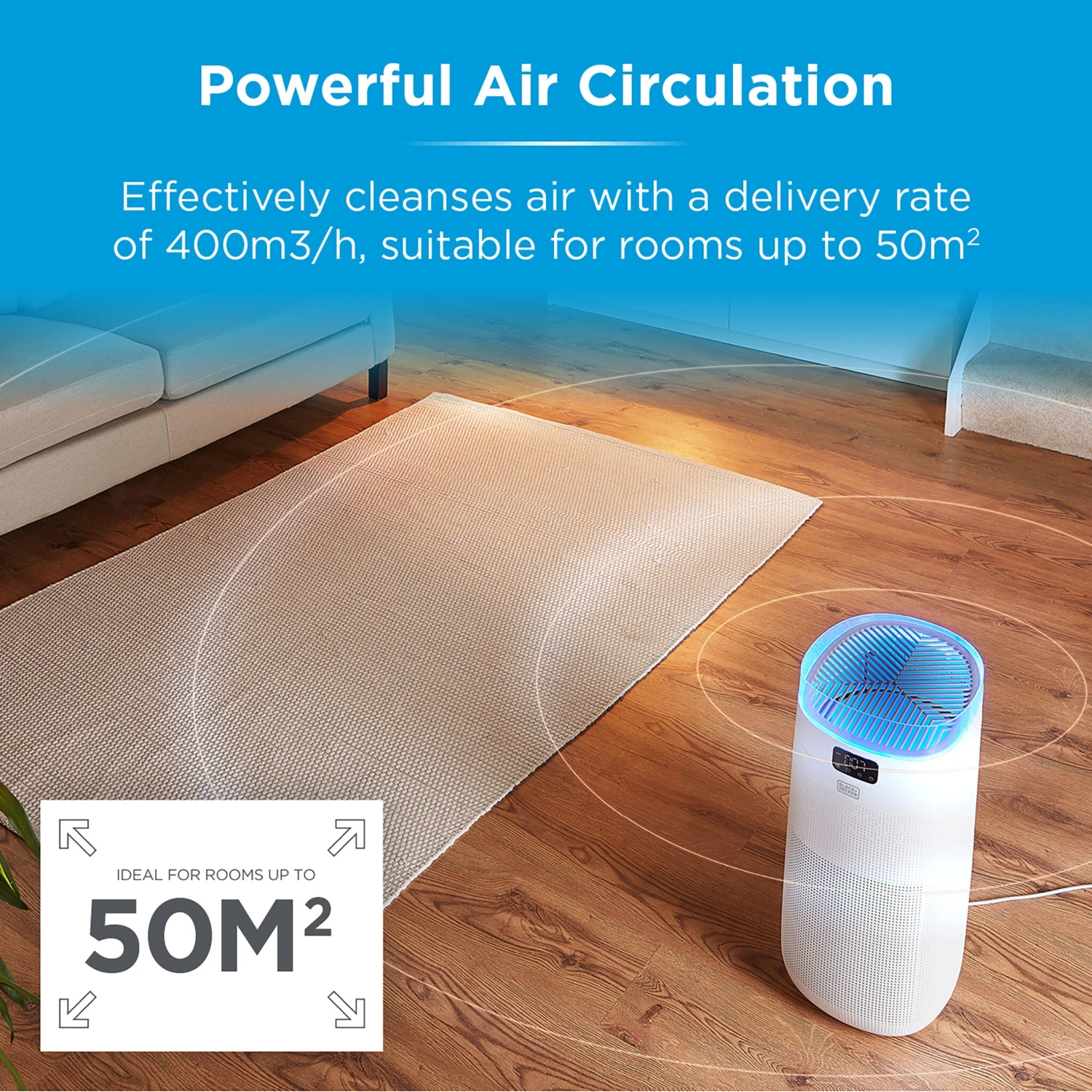 Using a built-in HEPA13 filter, this air purifier is able to remove up to 99.97% of fine particles trapped in the air, eliminating allergens and bacteria to create healthy airflow around your home. Its powerful air purification technology can cleanse air in large rooms up to 50m2, capturing dust and pet hair with a pre-filter to improve your allergies all year round. It features an anti-bacteria filter to trap harmful particles, in addition to a UV light to kill bacteria and germs. Its carbon filter helps cleanse unpleasant odours to refresh your room’s scent. Select from sleep, high or automatic air purification modes for effective cleansing based on your air quality, indicated by 7 LED lights which display the current amount of air pollution in the room. An 8-hour timer can be set to automatically shut down the device at a specified time to save energy.