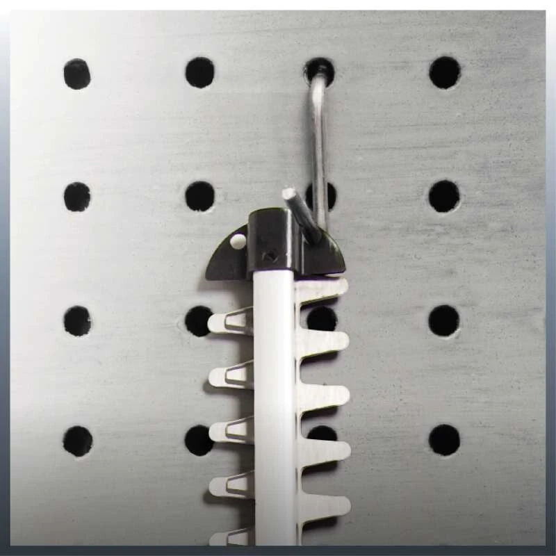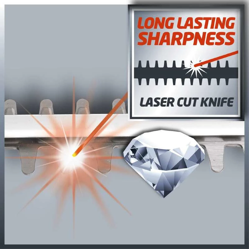 The GE-CH 1846 Li Kit cordless hedge trimmer is an efficient tool which thanks to its low weight and handy size provides good service for the trimming of hedges, shrubs and bushes on large grounds and allotments where there is no connection to the electric power grid. With the new Power X-Change battery system from Einhell, the hedge trimmer has a 18 V battery pack with 2.0 Ah for long work sessions. The GE-CH 1846 Li Kit has a battery charge level indicator with three LEDs where you can check the current charge level at a glance. In addition, the battery packs can be used for all products from the Power X-Change family. Complete with an additional high-speed charger. The integrated two-hand safety switch brings the cutters to a standstill in less than 1 second when a switch is released. The cutters are protected by an aluminium cover. The shock guard has a hole for wall mounting and enables this cordless hedge trimmer to be stored away in an instant in minimum space. For a long service life the gearing is made of metal, for clean cutting results the blades are made of laser-cut and diamond-ground steel. The GE-CH 1846 Li Kit comes with a sturdy cutter guard for safe and user-friendly transportation or storage.