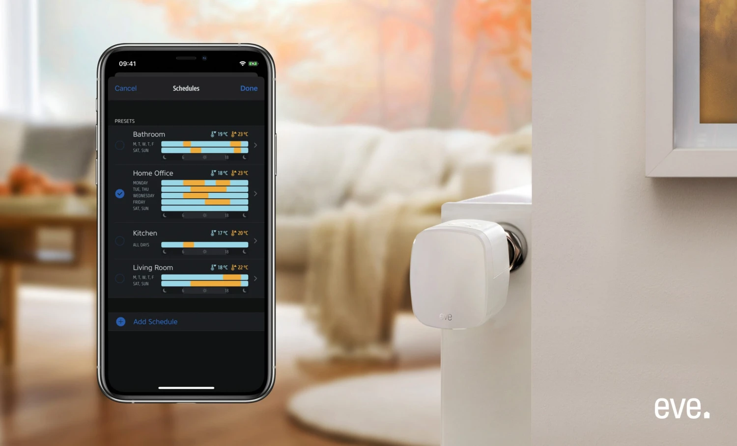 With Eve Thermo, enjoy perfect comfort on your terms. Create autonomous schedules to synchronize your heating with your routine. Use schedules to heat individual rooms or your entire home automatically – independently of your iPhone and internet connection. Control your room temperature with ease using the app, Siri, schedules, the integrated touch controls, or based on your presence. Eve Thermo synchronizes your heating based on your routine: You’ll be able to save energy when away from home or make your place a cozy haven of relaxation when you’re there.