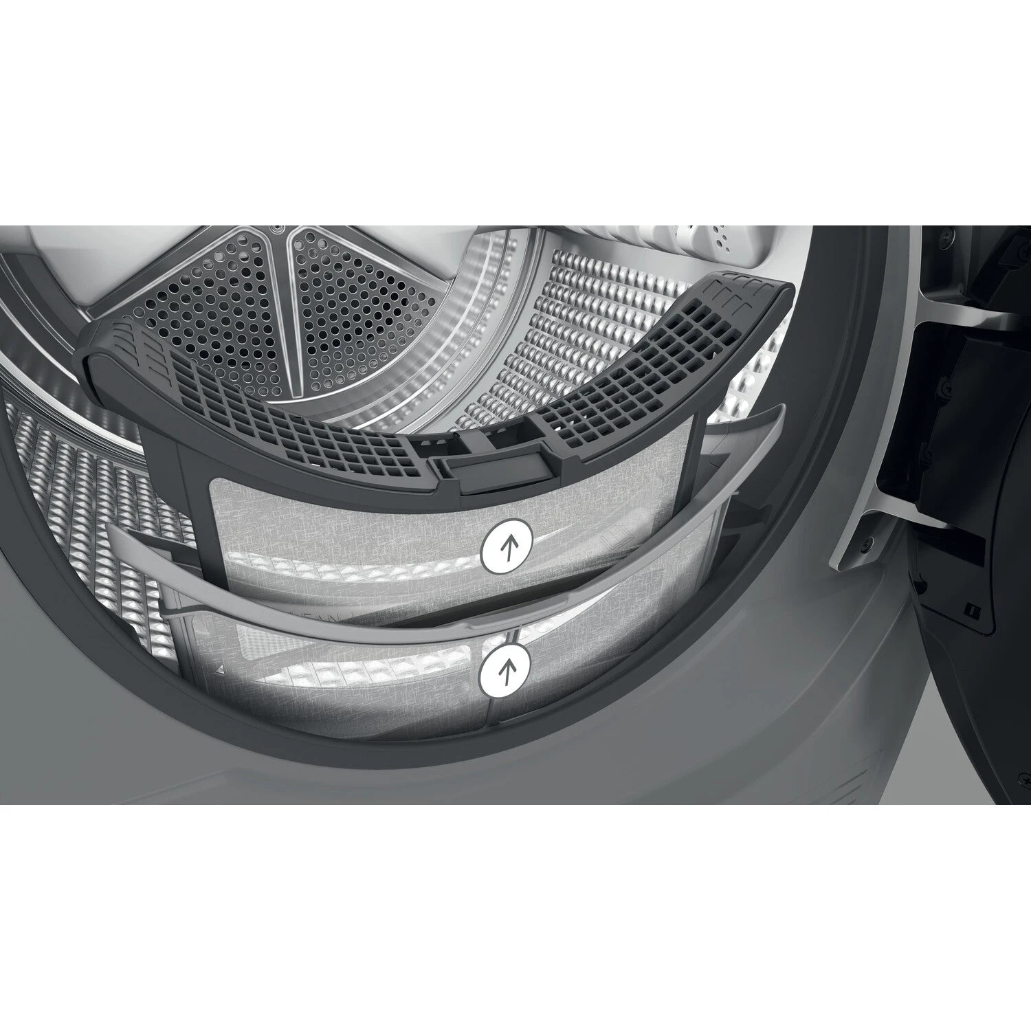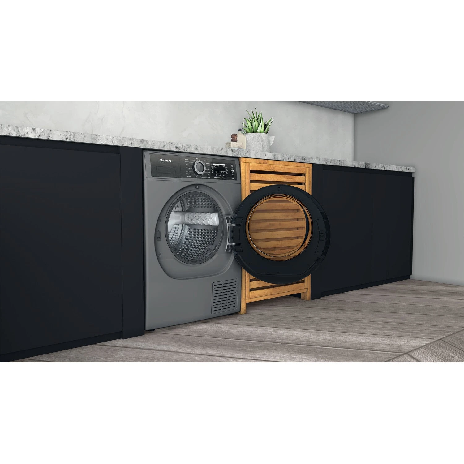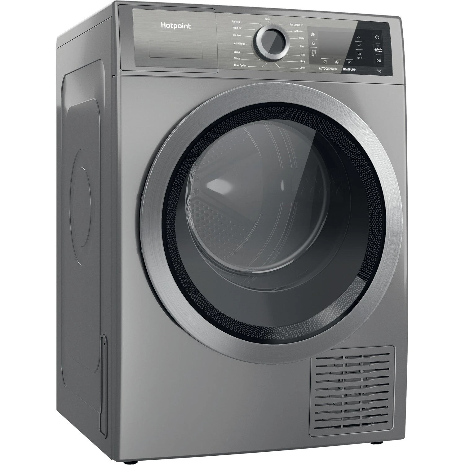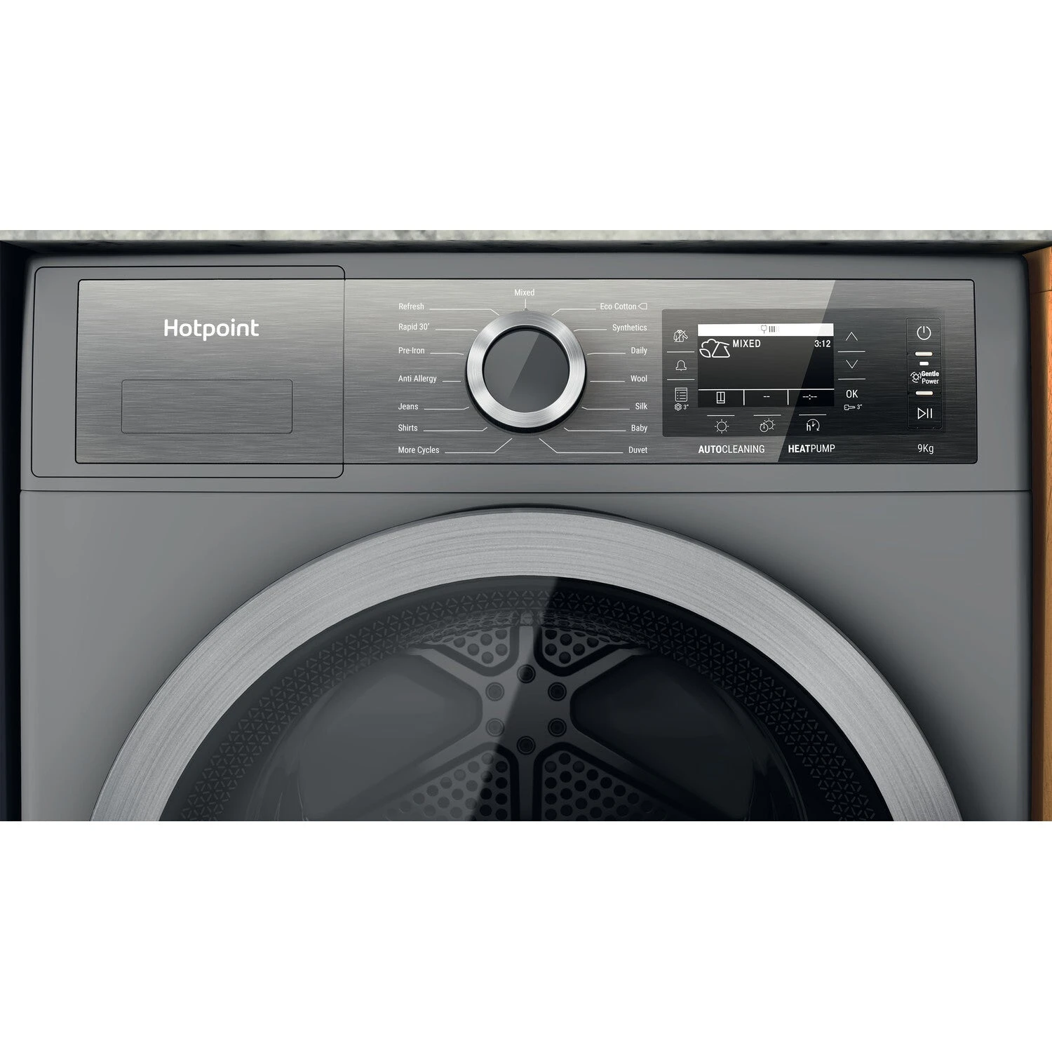 Achieve impeccable drying results with the Hotpoint GentlePower H8 D94SB UK dryer. GentlePower technology ensures extraordinary drying performance for all types of laundry including bedding and towels, while clever drum movements reduce fabric wear. Clever heat pump technology provides maximum efficiency by saving up to 68% in energy consumption. Awarded the Allergy-UK seal of approval, our dedicated Anti-Allergy cycle takes care of what matters most by removing major allergens such as pollen, mites and pet hair. Make ironing easier, the Pre-Iron cycle will carefully tumble your garments as well as being treated by gentle heat that will reduce wrinkles offering optimum care for your clothes.