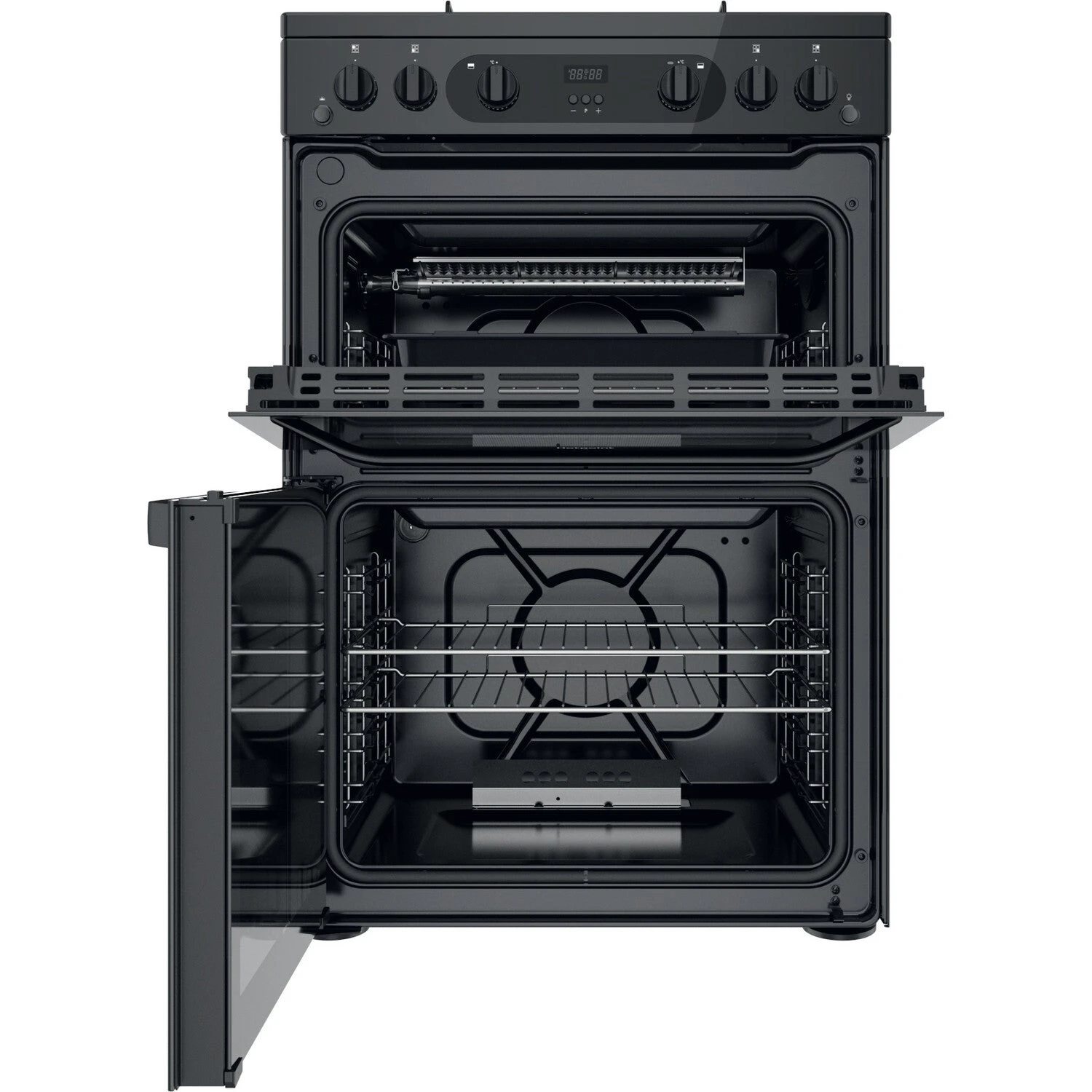 Hotpoint HDM67G0CMB/UK. Product type: Freestanding cooker, Product colour: Black, Control type: Buttons, Rotary. Hob type: Gas, Number of cooking zones: 4 zone(s), Gas type: Methane/LPG. Oven size: Medium, Oven power source: Gas, Oven net capacity: 70 L. Oven 2 size: Small, Oven 2 power source: Gas, Oven 2 position: Top. Energy efficiency class: A, Energy consumption (conventional): 0.99 kWh, Oven 2 energy efficiency class: A