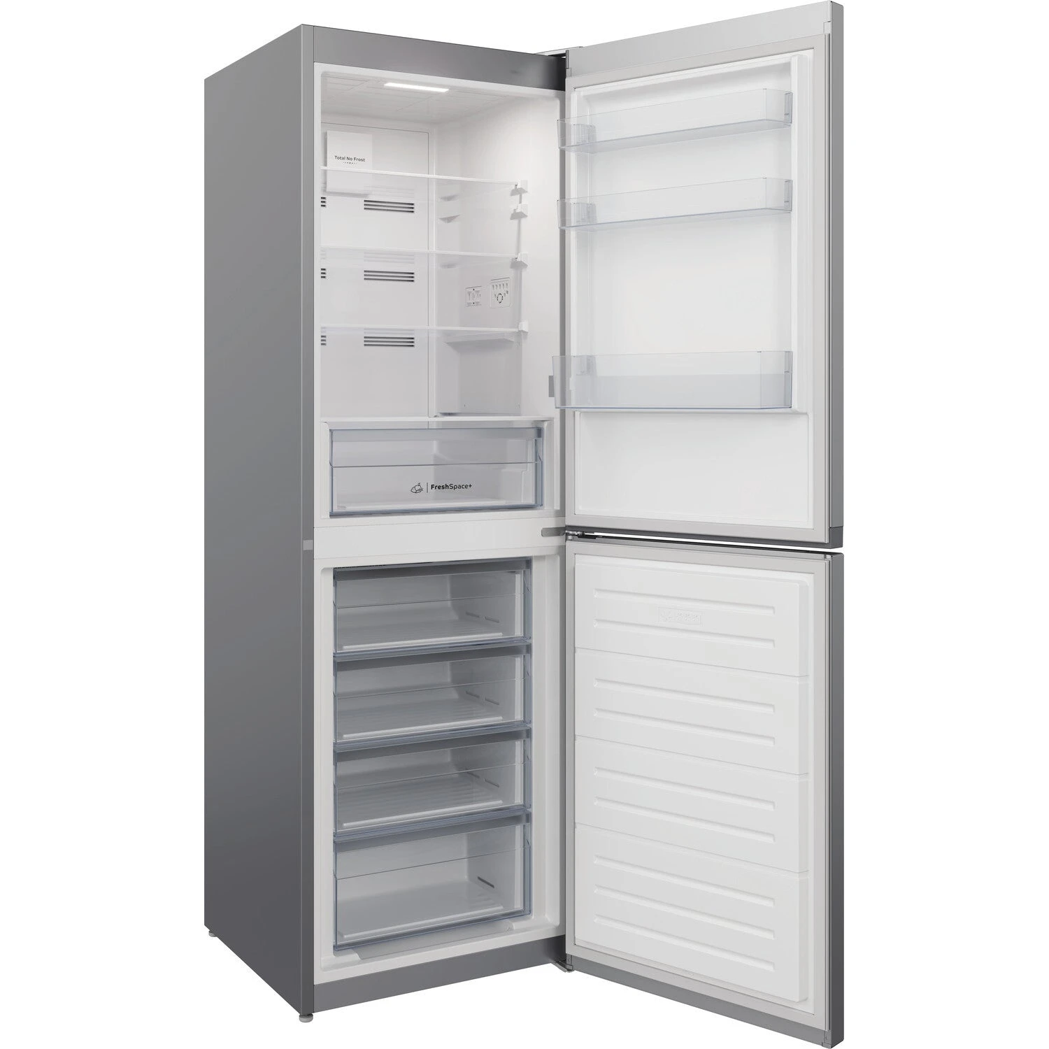 Indesit INFC8 50TI1 S 1. Total net capacity: 322 L. Door hinge: Right, Display type: LED. Climate class: SN-T, Noise level: 42 dB. Fridge net capacity: 202 L, No Frost (fridge), Multi-Airflow system (fridge), Fridge interior light. Freezer net capacity: 120 L, Freezing capacity: 8 kg/24h, No Frost (freezer). Energy efficiency class: F, Annual energy consumption: 314 kWh. Product colour: Silver