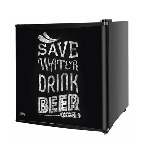 The Kuhla KTTF4BGB-1003 “Save Water, Drink Beer” design table top fridge measures just (H)49.2 x (W)47.2 x (D)45.0 CMs yet boasts a very impressive capacity of 43 litres. This modern, stylish and space saving appliance provides efficient refrigeration with an A+ energy rating.