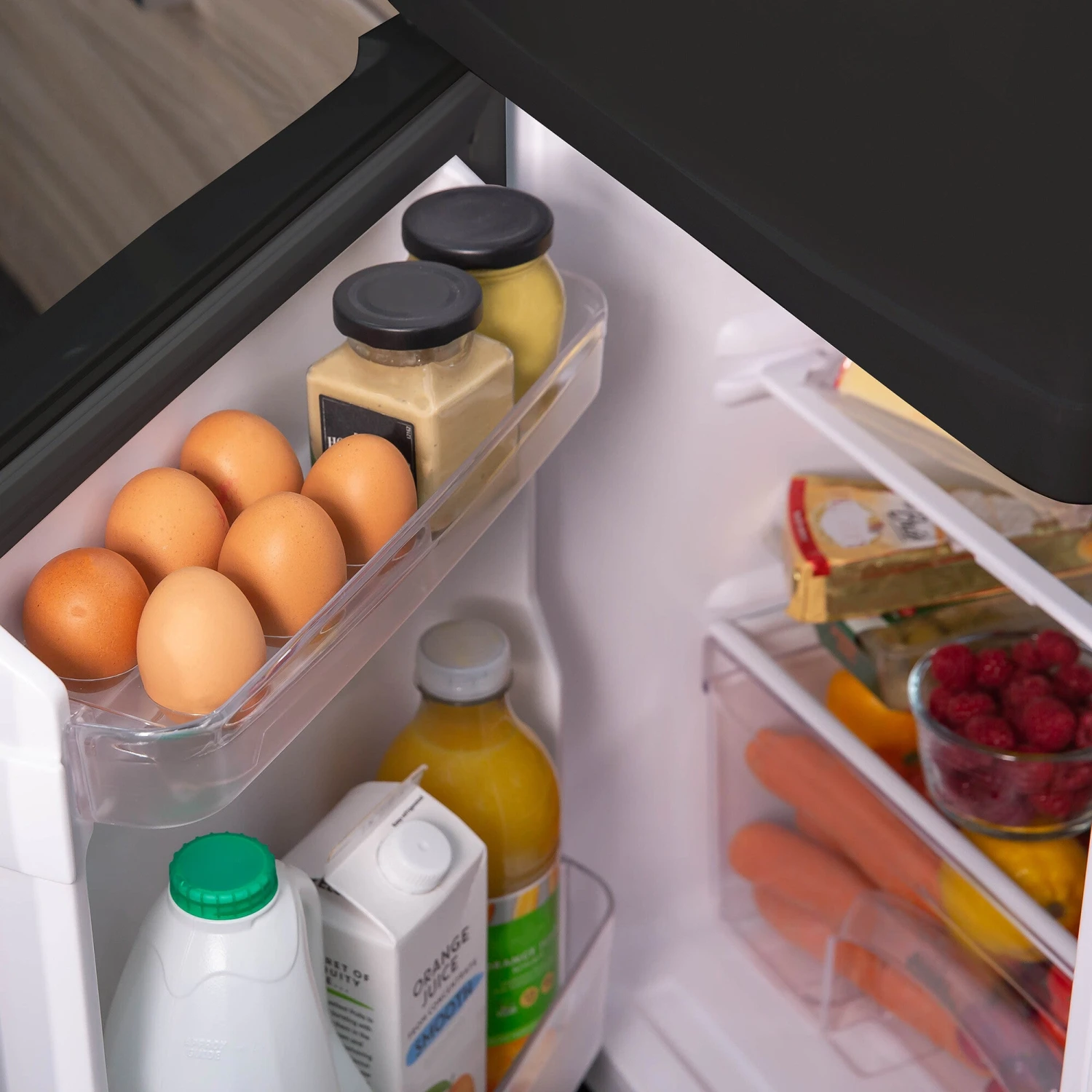 This model features an adjustable thermostat, so you can precisely set the temperature to suit the contents of your fridge. There’s also a reversible door for versatility, so you can place your fridge wherever you want it in your kitchen or utility room. Plus, there are adjustable feet to ensure your fridge is stable on uneven surfaces.