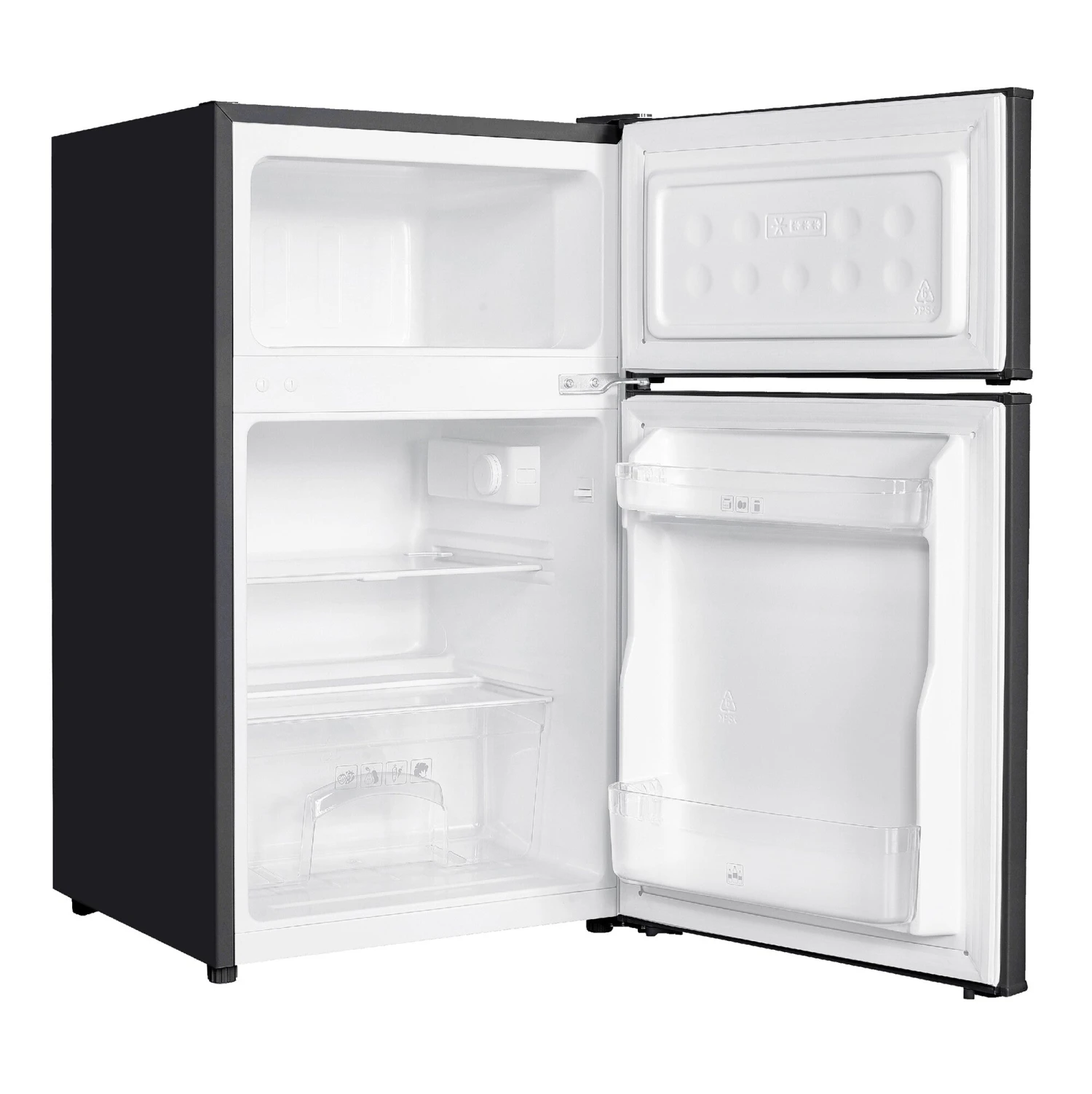 Russell Hobbs RH48UCFF2B. Total net capacity: 85 L. Door hinge: Right. Climate class: SN, Noise level: 40 dB. Fridge net capacity: 61 L, Fridge interior light, Fridge number of shelves/baskets: 2, Number of vegetable drawers: 1. Freezer net capacity: 24 L, Freezing capacity: 2.4 kg/24h. Energy efficiency class: F, Annual energy consumption: 207 kWh. Product colour: Black, White