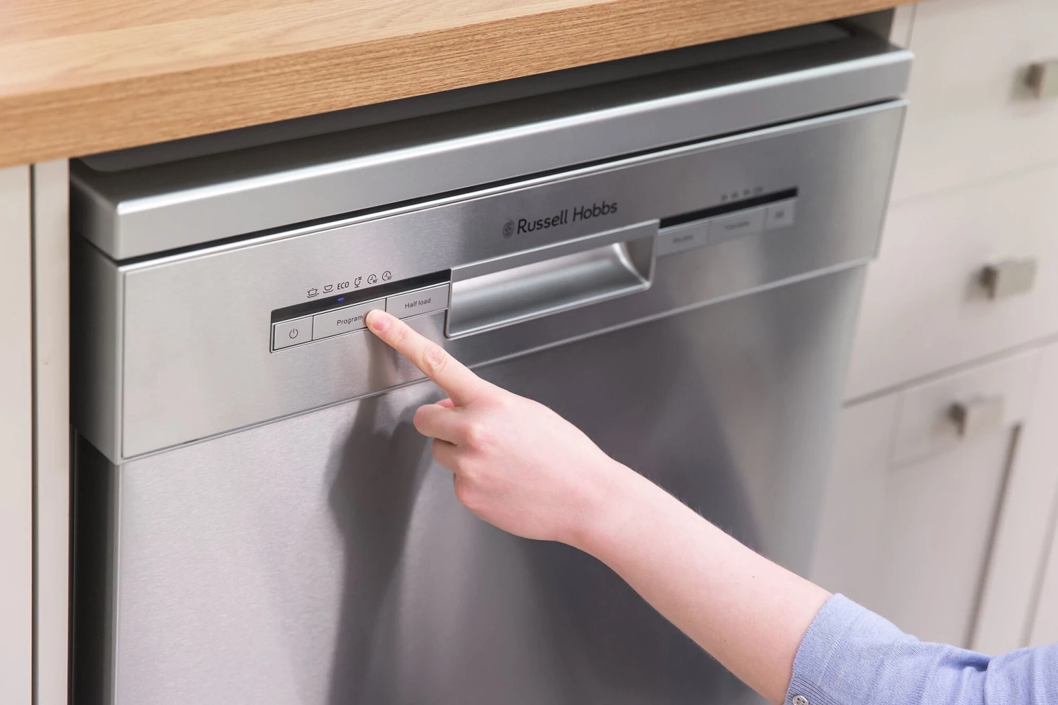 This Russell Hobbs dishwasher has an impressive new energy rating D, to save you money on your energy bills. With its’ intuitive Dry Plus Technology this dishwasher has an auto release door which is designed to improve the overall drying performance. By automatically opening the door at the end of the drying cycle by up to 10cm this helps to reduce the residual humidity and lets the fresh air in to the dishwasher cavity so that it speeds up the overall drying time and helps to reduce overall energy costs.