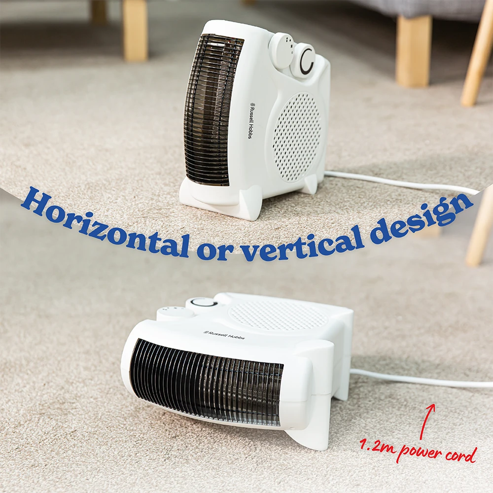 This freestanding fan heater from Russell Hobbs is the perfect portable product to warm your home during cold spells and winter months. It features 2 heat settings for added flexibility – 1000W for low heat and 2000W for high heat, whilst the built in adjustable thermostat helps you maintain the perfect level of heat. This versatile fan heater can be used in a horizontal or vertical position, depending on the setting. The compact design and cool touch outer are ideal if you need a heat source that can be moved around the home, from room to room. There’s also an integrated handle and 1.2m power cord. Portable yet powerful, this heater is ideal for warming spaces up to 20m², making it ideal for rooms up to the size of a living room or double bedroom.