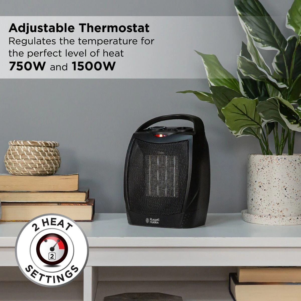 This fan heater offers 2 heat settings for complete flexibility during cold spells and winter months – 750W for low heat and 1500W for high heat. The built in adjustable thermostat helps you maintain the perfect level of warmth.