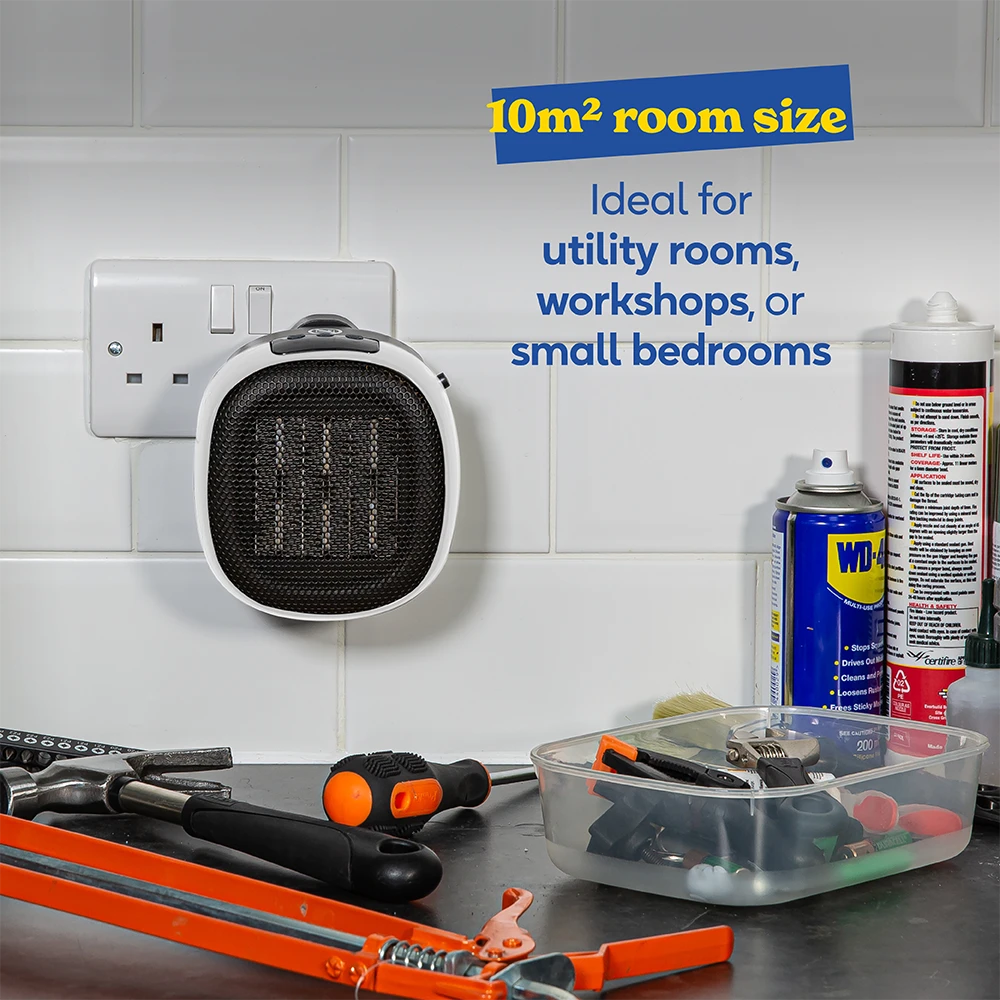 This Compact Ceramic Plug Heater from Russell Hobbs is the perfect portable product to warm your home office, living space, or even your caravan. Ideal for travel, the compact size means you can simply slip it into your bag for convenient heating wherever you are. This versatile plug-in heater provides up to 30°C of heat from 700W of power and features 2 fan speeds for added flexibility. The built in adjustable thermostat helps you maintain the perfect level of heat in any space up to 10m², meaning it’s great for utility rooms, workshops or small bedrooms. Using ceramic heating technology and an ultra-quiet fan, this heater plugs straight into the wall with no power cord and works efficiently yet quietly. The compact design and cool touch outer are ideal if you need a heat source that can be moved around the home, from room to room. Plus, there’s an easy to read LED display and 12 hour timer, which can be used to heat your home at times to suit your daily routine.