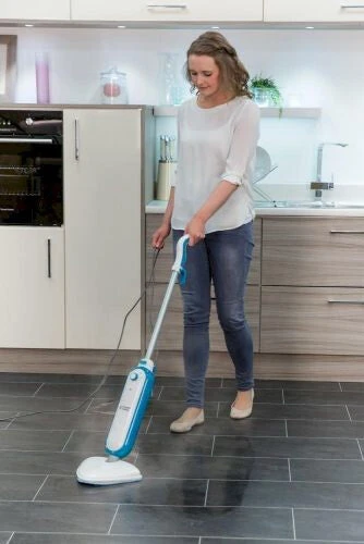 Lightweight and easy to assemble, at just 2.3Kg the Steam & Clean mop is a great addition to your cleaning routine. No need for your old mop and bucket and no more use of harsh chemicals. Simply fill up the tank using the handy measuring jug provided, plug in the extra-long 5m cable and within just 15 seconds you’re ready to start steaming. With a 380ml water tank you can get up to 15 minutes steam time, ideal for a quick clean up. The specially designed microfiber mop pads trap dirt, sticky residue and moisture for a deep clean that leaves great results every time. Ideal for bathrooms, families and pet owners, steam kills up to 99.9% of all known household germs and bacteria, giving you peace of mind.