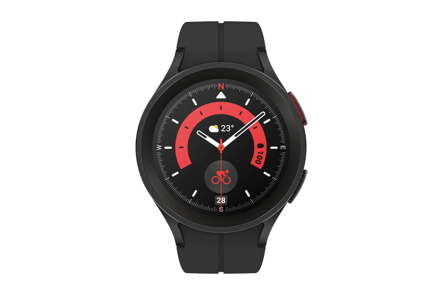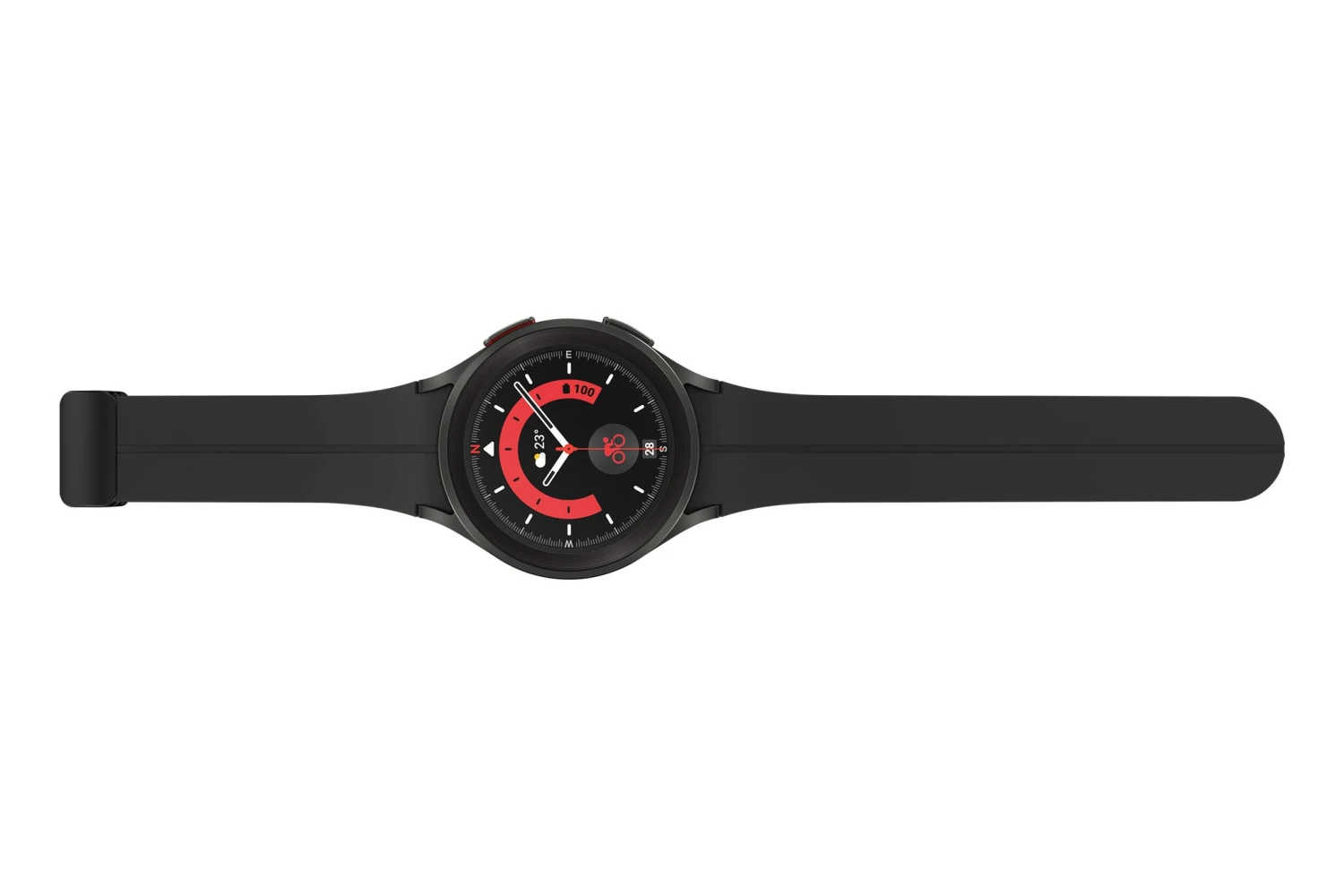 Samsung Galaxy Watch5 Pro . Display diagonal: 3.56 cm (1.4″), Display technology: OLED, Display resolution: 450 x 450 pixels, Touchscreen. Processor frequency: 1180 MHz, RAM capacity: 1500 MB, Flash memory: 16 GB. Wi-Fi. GPS (satellite). Battery capacity: 590 mAh. Weight: 46.5 g. Waterproof up to: 50 m, Band colour: Black, Band size: One Size. Operating system installed: Wear OS