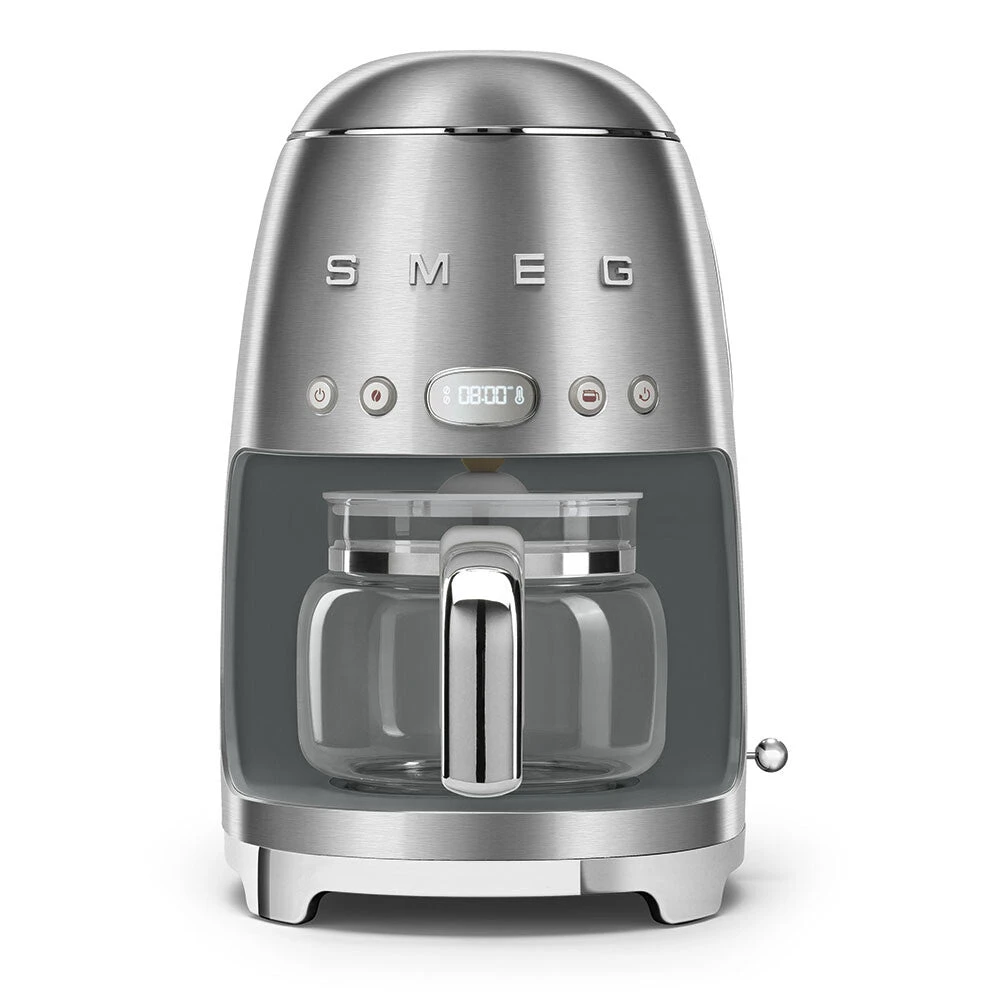 Smeg DCF02SSUK. Product type: Drip coffee maker, Coffee maker type: Semi-auto, Water tank capacity: 1.4 L, Coffee input type: Ground coffee, Reservoir for brewed coffee: Jug, Capacity in cups: 10 cups. Display type: LED. Power: 1050 W. Product colour: Stainless steel