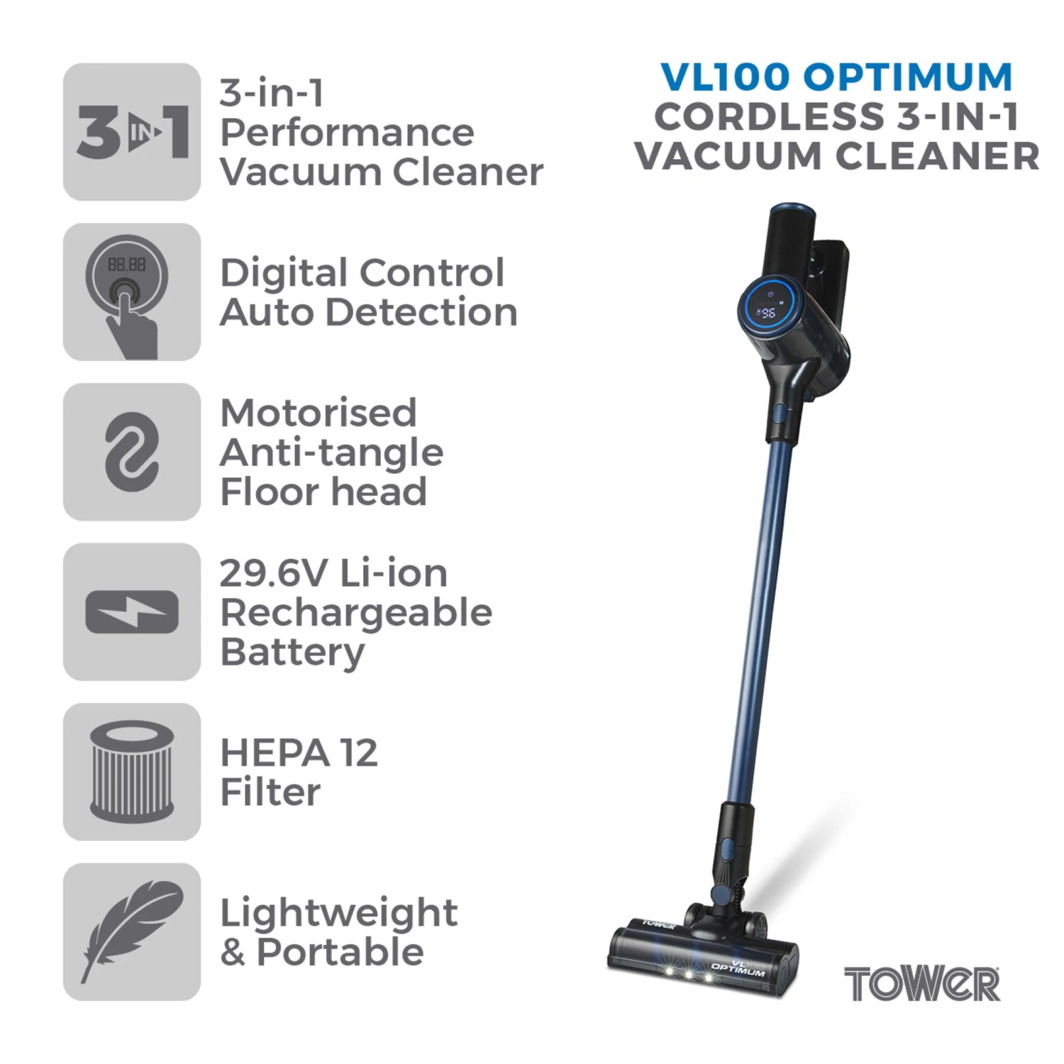 Tower T513012AT VL100 Optimum Cordless 3-in-1 Pole Vacuum Cleaner with HEPA 12 Filter, 1L Dust Tank, 11Kpa, 29.6V, Dark Blue & Black