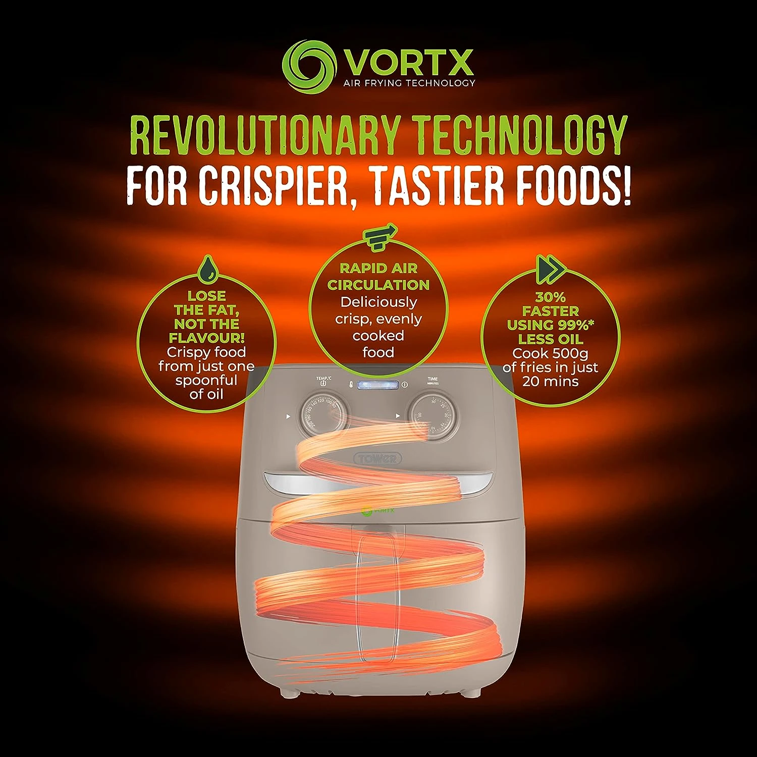 Exclusive to Tower Air Fryers, Vortx technology rapidly circulates hot air around food, cooking up to 30% faster than a conventional oven. Vortx also cooks food with little or no oil, making it much healthier, too! Lose the fat not the flavour with Vortx Air Frying Technology