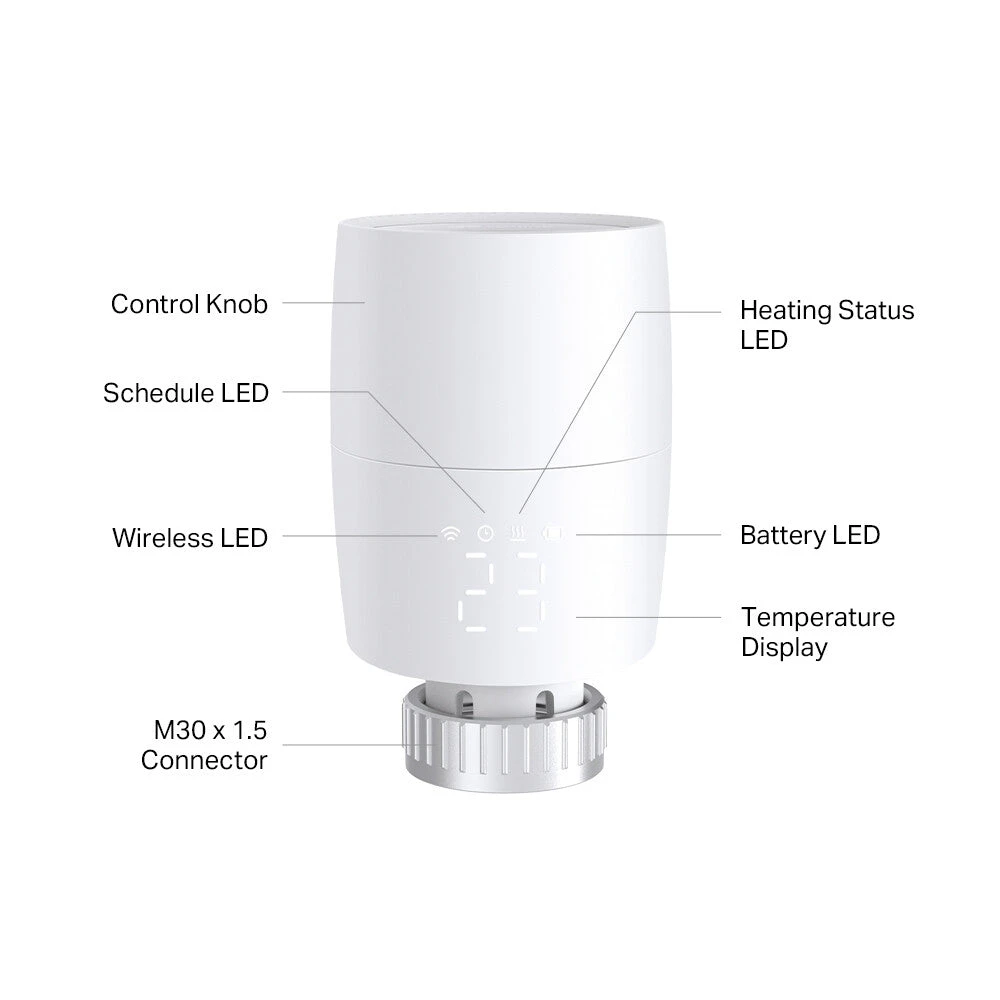 Kasa Smart Thermostatic Radiator Valve. Product colour: White, Material: Polycarbonate, Control type: Rotary. Display type: LED. Battery type: AA, Battery voltage: 1.5 V. Diameter: 5.65 cm, Height: 84 mm. Package type: Box