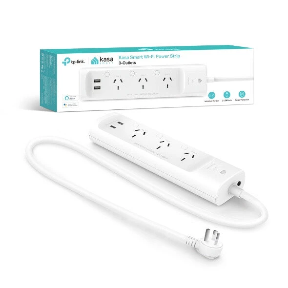 TP-Link Kasa Smart Wi-Fi Power Strip, 3-Outlets. AC outlets quantity: 3 AC outlet(s), Power plug type: Type G, Connectivity technology: Wireless. AC input voltage: 220 – 250 V, AC input frequency: 50 – 60 Hz, Maximum current: 13 A. Width: 260 mm, Depth: 63.4 mm, Height: 38.5 mm. Wi-Fi standards: 802.11b, 802.11g, Wi-Fi 4 (802.11n), USB port type: USB Type-A